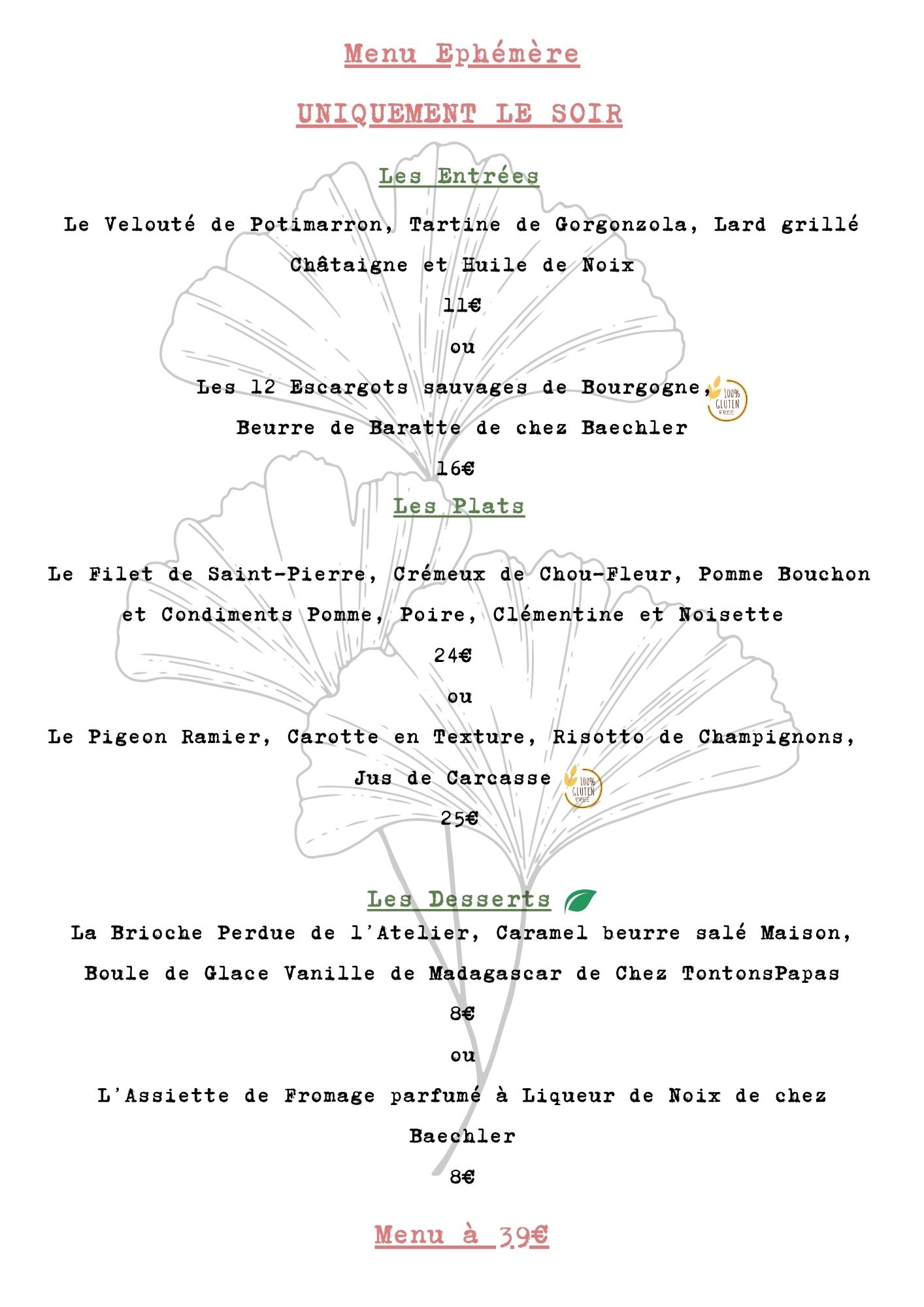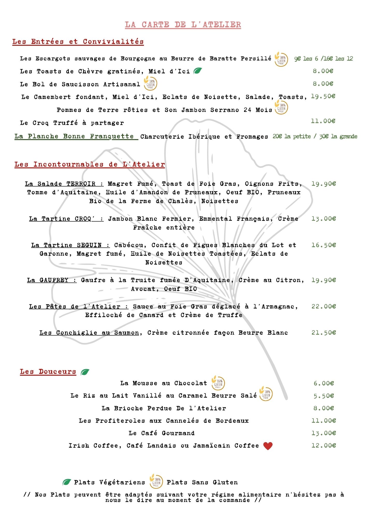 Du matin au soir l'Atelier vous accueille pour des boissons chaudes ou fraîches, une formule du midi, des salades, tartines et planches gourmandes, une carte l'après-midi pour les gouters et petites faims, le tout avec des produits locaux et de saison.